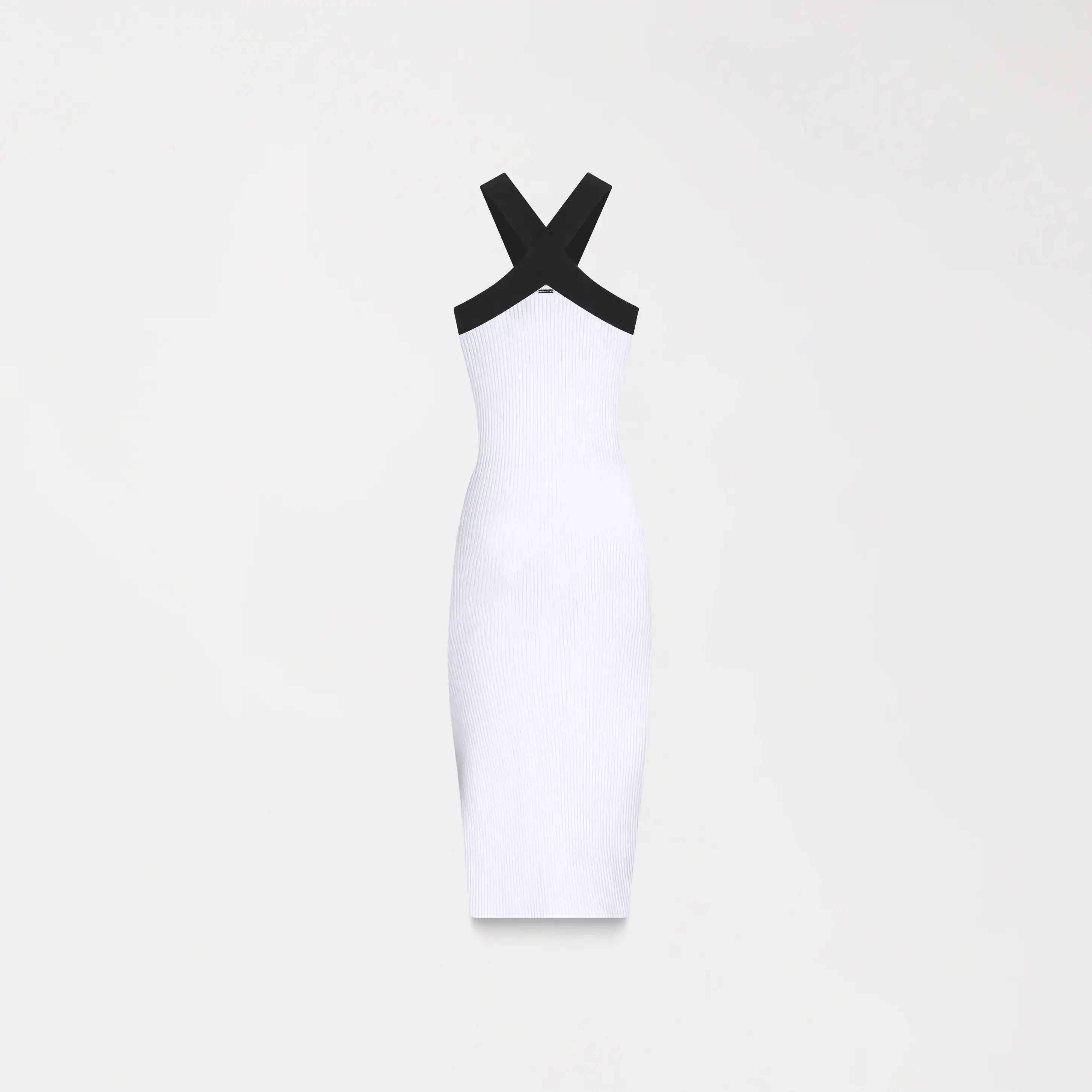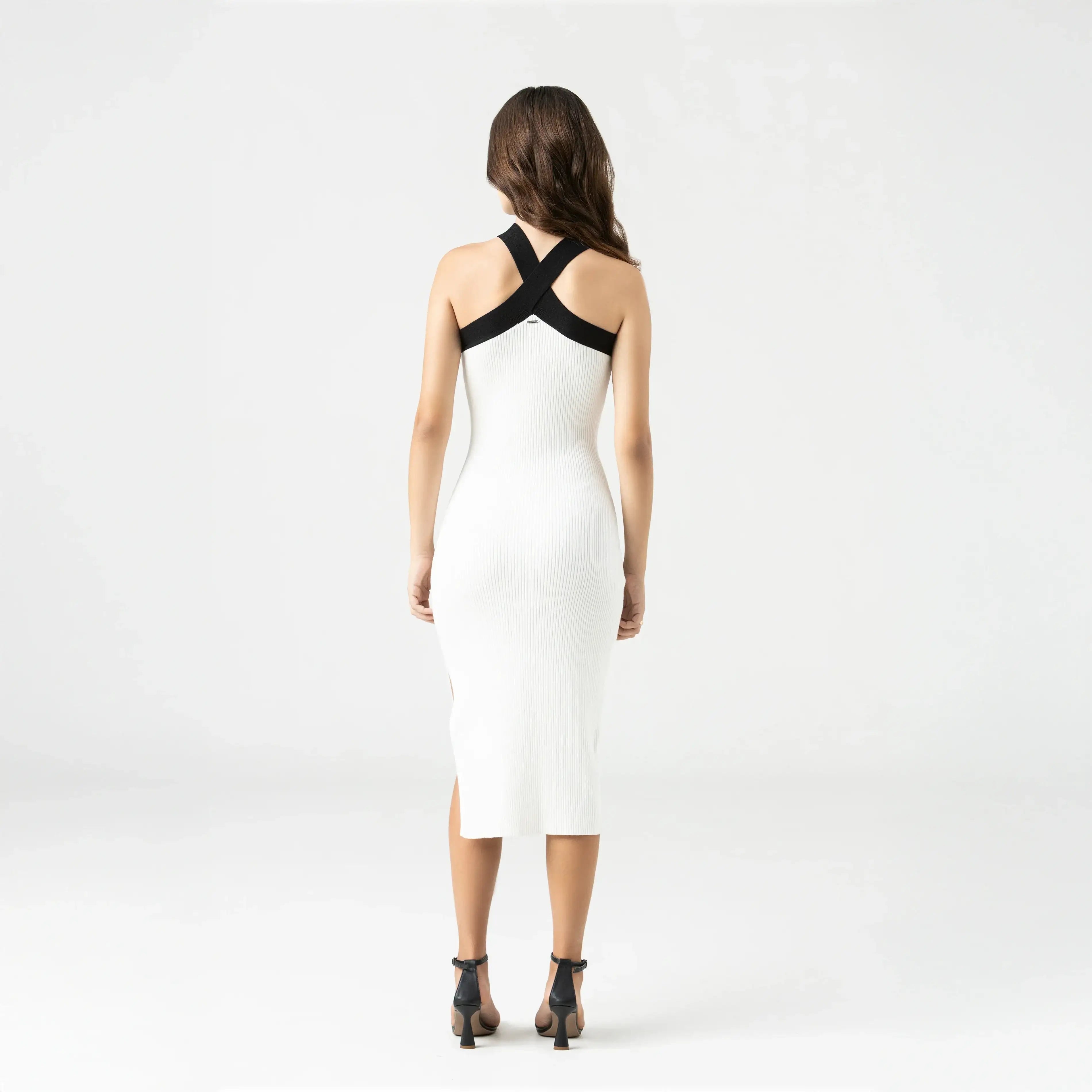 Blom es un vestido confeccionado en tejido exclusivo de Monastery, con estructura y elasticidad que definen la silueta con firmeza. Su diseño halter realza hombros y cuello, mientras que la placa metálica Monastery en acabado plata brillante destaca como sello de identidad. Una prenda elegante, diseñada para resaltar la forma con seguridad y estilo.