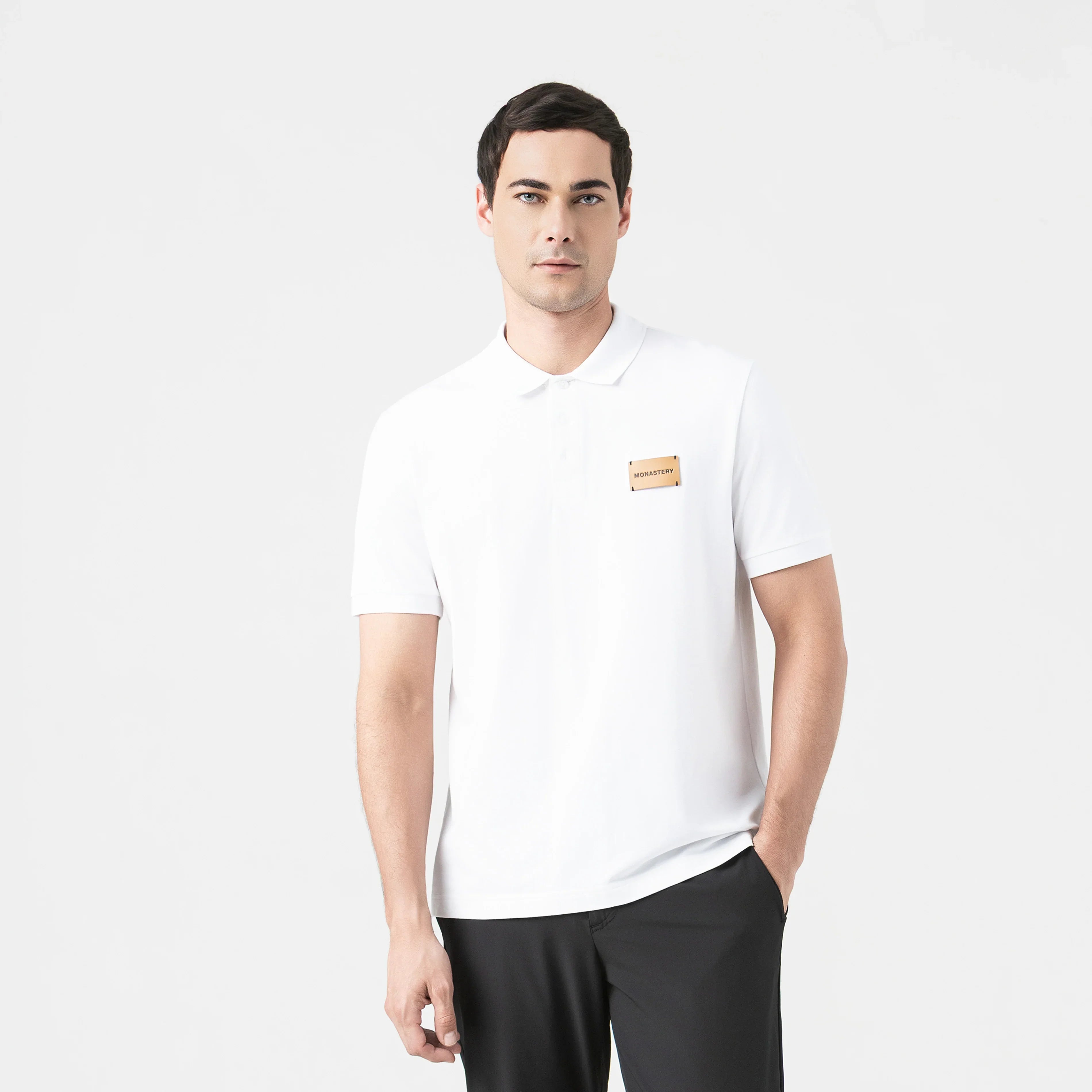 Brunello es una polo masculina confeccionada en algodón 100% pima peruano exclusivo para Monastery, reconocida por su suavidad y durabilidad. Su silueta regular encuentra el equilibrio entre comodidad y estructura, mientras que el cuello rectilíneo y los puños tejidos refuerzan la sofisticación del diseño. Al frente, un aplique con el logo Monastery aporta un punto focal distintivo acompañado de botones contramarcados que reflejan atención al detalle. En la espalda, un estampado plano sutil realza su carácter auténtico y refinado. Una prenda diseñada para elevar lo casual con naturalidad y elegancia atemporal.