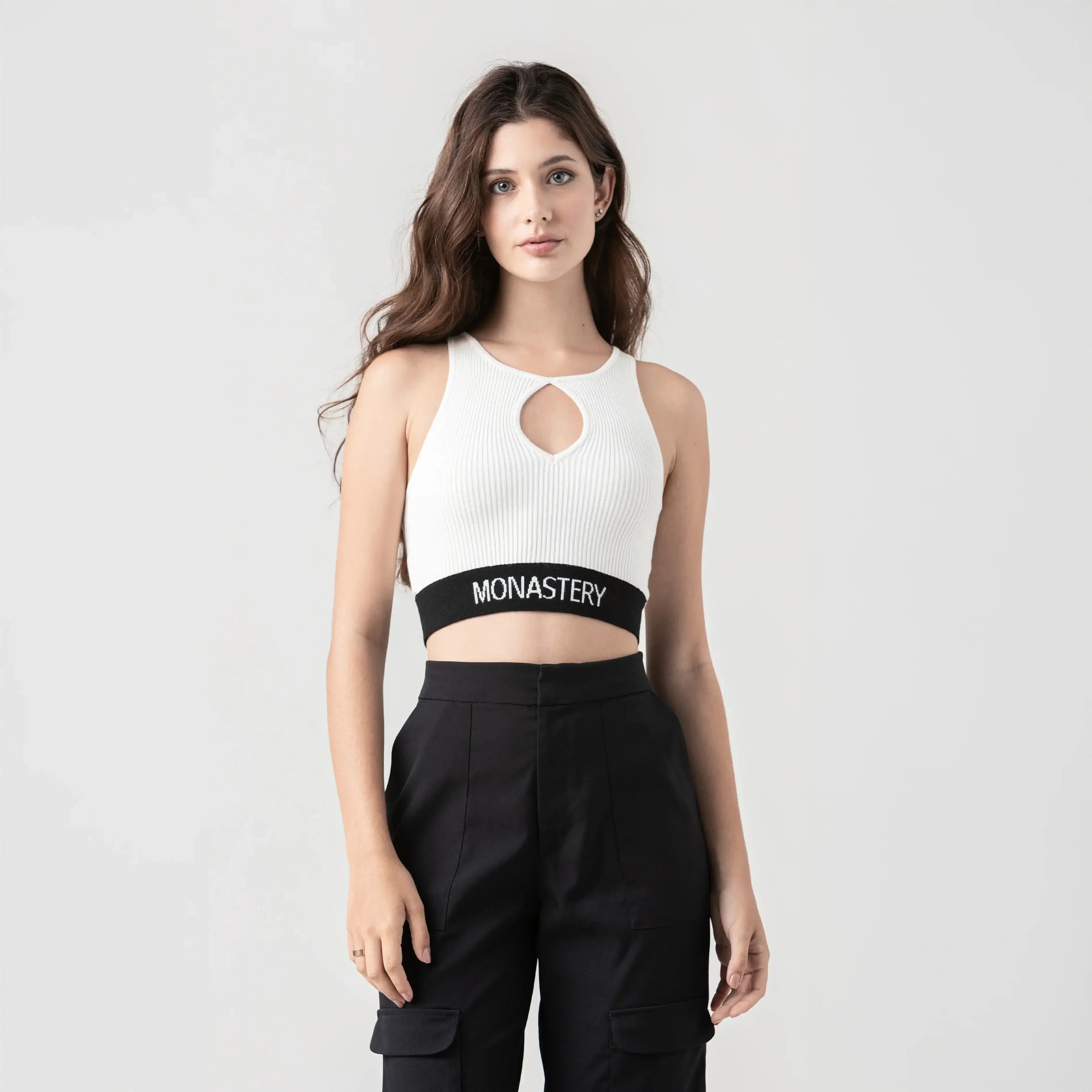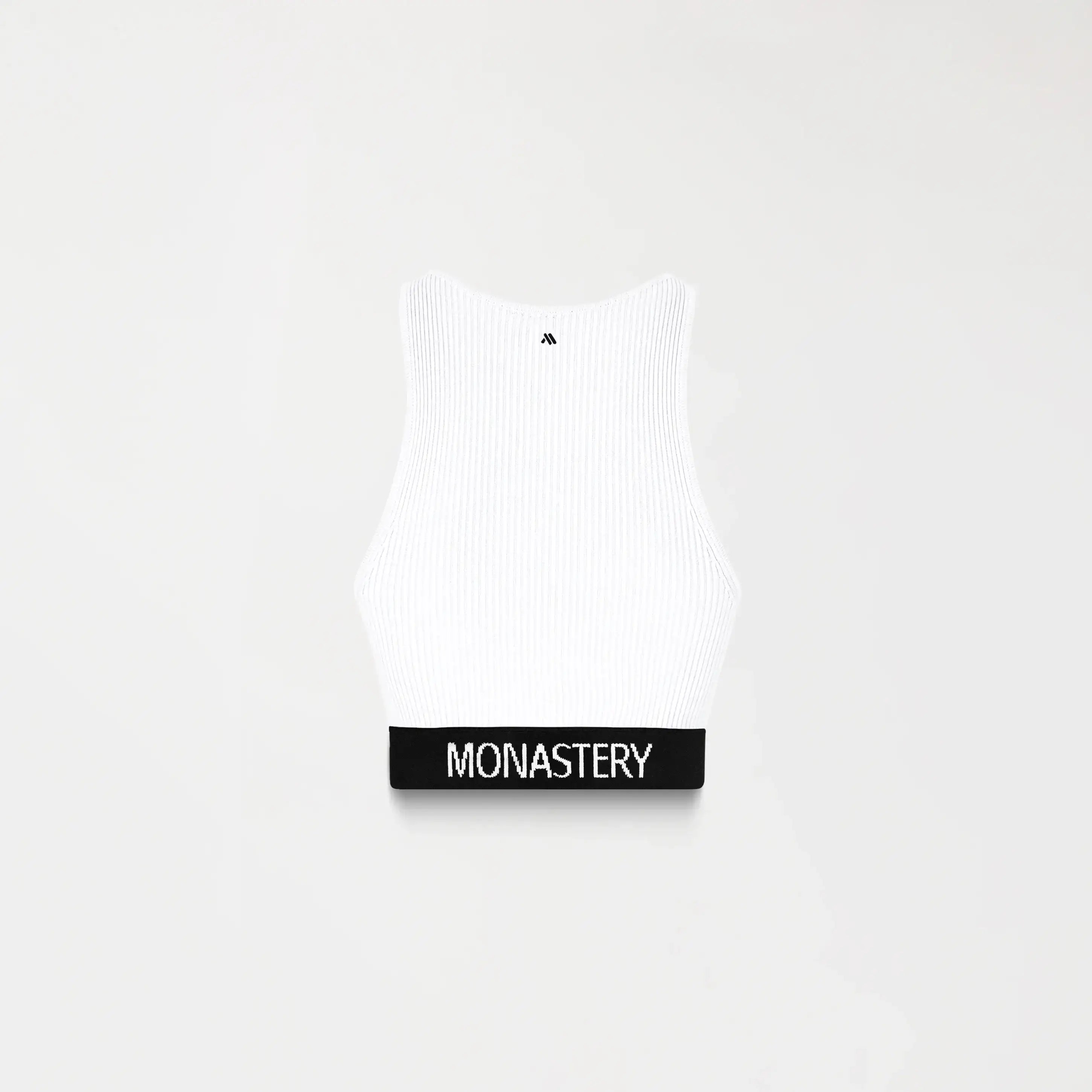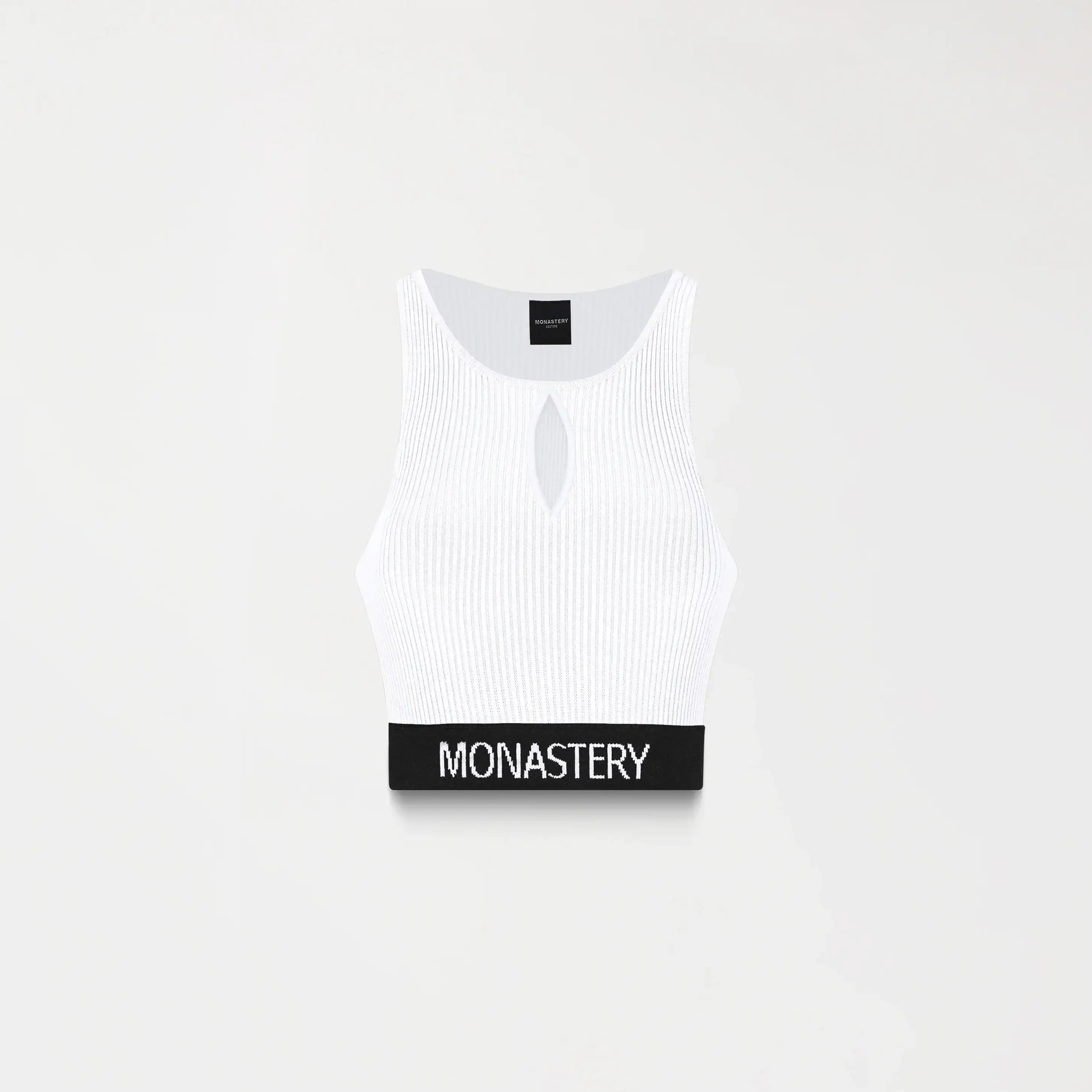 Top femenino confeccionado en tejido exclusivo de Monastery, diseñado para destacar con una construcción estructurada que realza la figura mediante un escote frontal preciso. La pretina elástica, visible a ambos lados, incorpora el logo Monastery como sello distintivo de identidad y continuidad visual. En la parte posterior, el logo insignia se presenta en bordado plano, aportando contraste y carácter sutil. Una pieza concebida para quienes valoran la unión entre forma, presencia y un diseño depurado.
