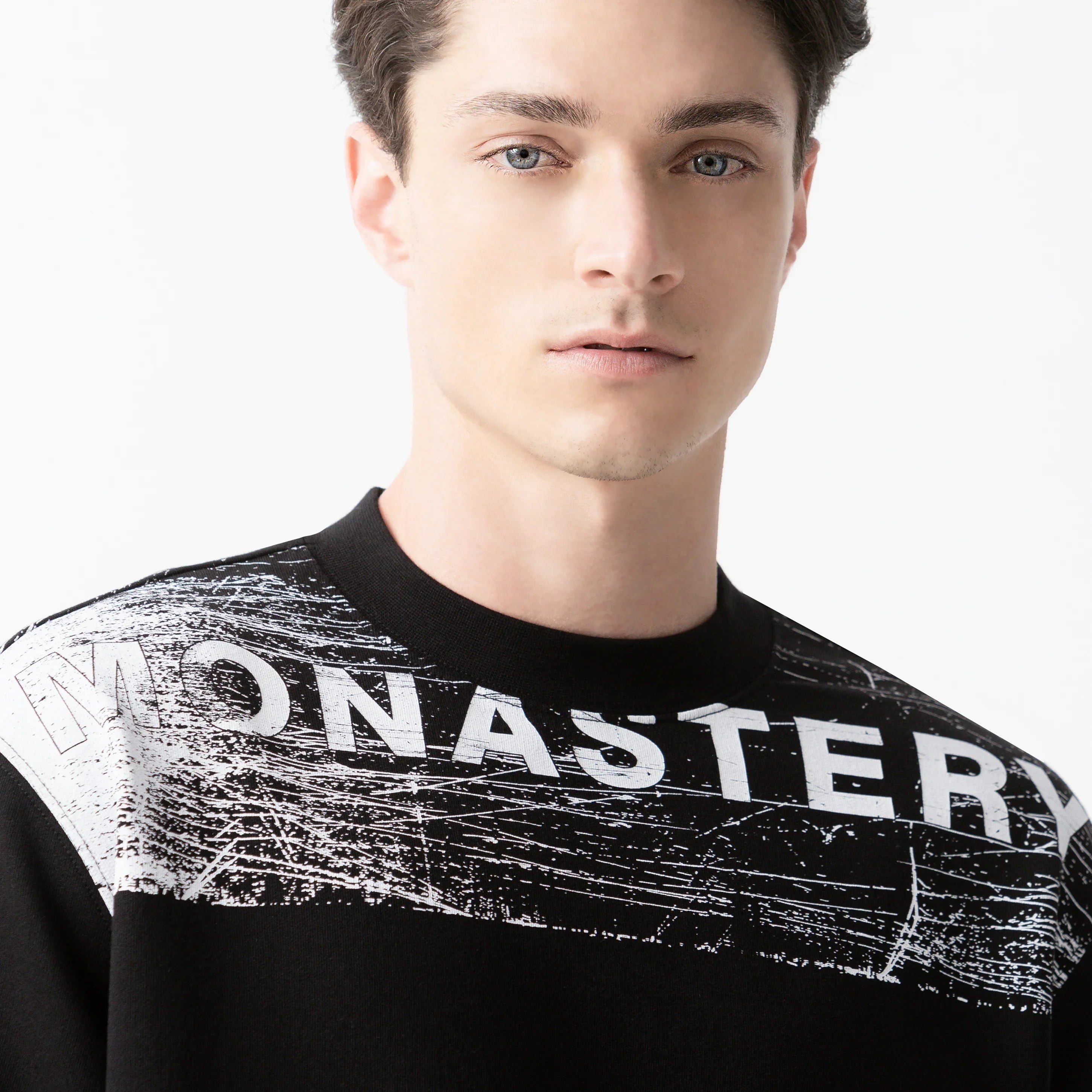 Su diseño incluye un cuello en rib de 2 cm, que aporta carácter y definición. En el frente y la espalda, los estampados en técnica de corrosión crean un contraste visual potente, resaltando la identidad gráfica de la prenda.