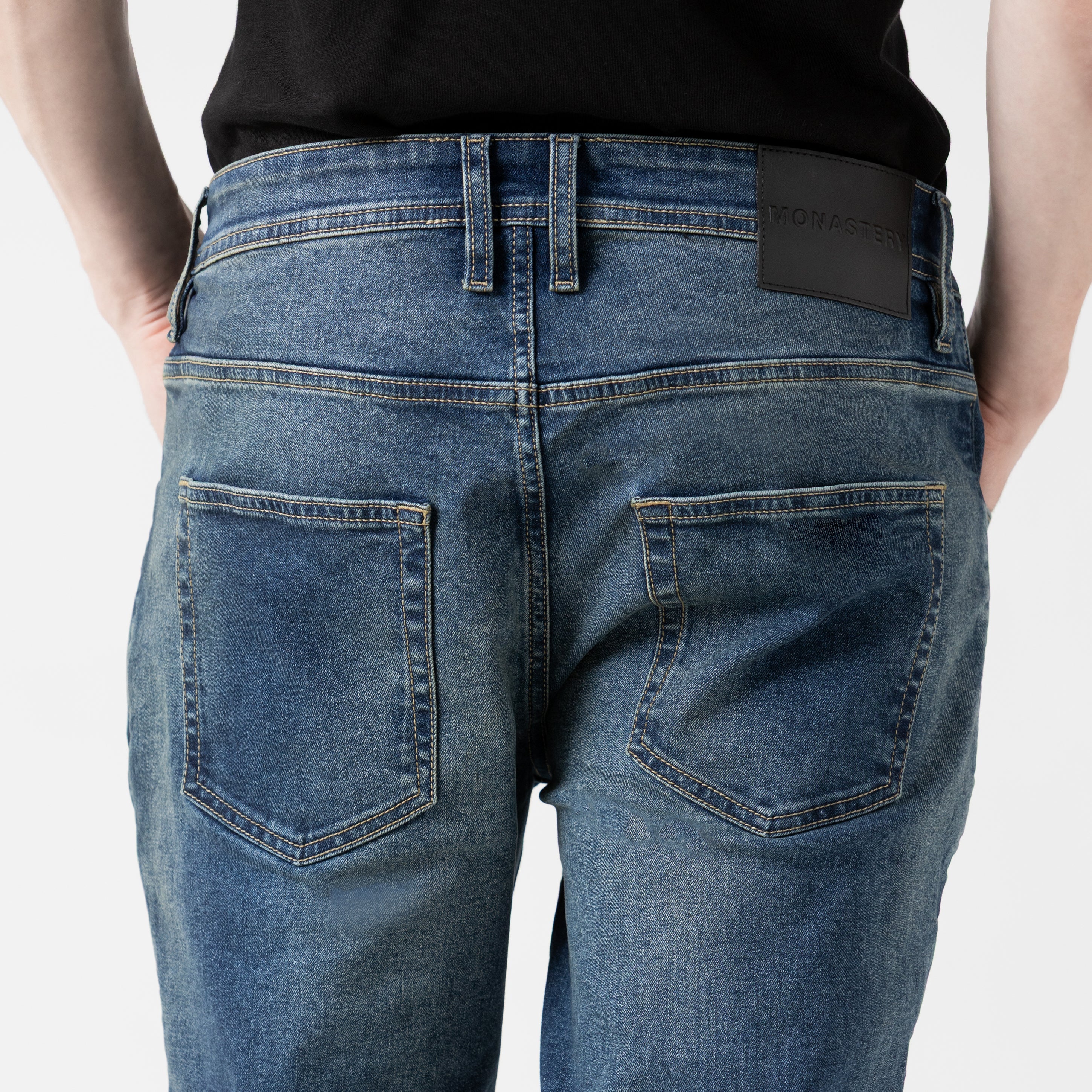 Presenta sutiles desgastes en muslos y rodillas, que aportan carácter sin perder elegancia, además de cinco bolsillos clásicos y un aplique metálico posterior que resalta la identidad de la marca con un toque distintivo.