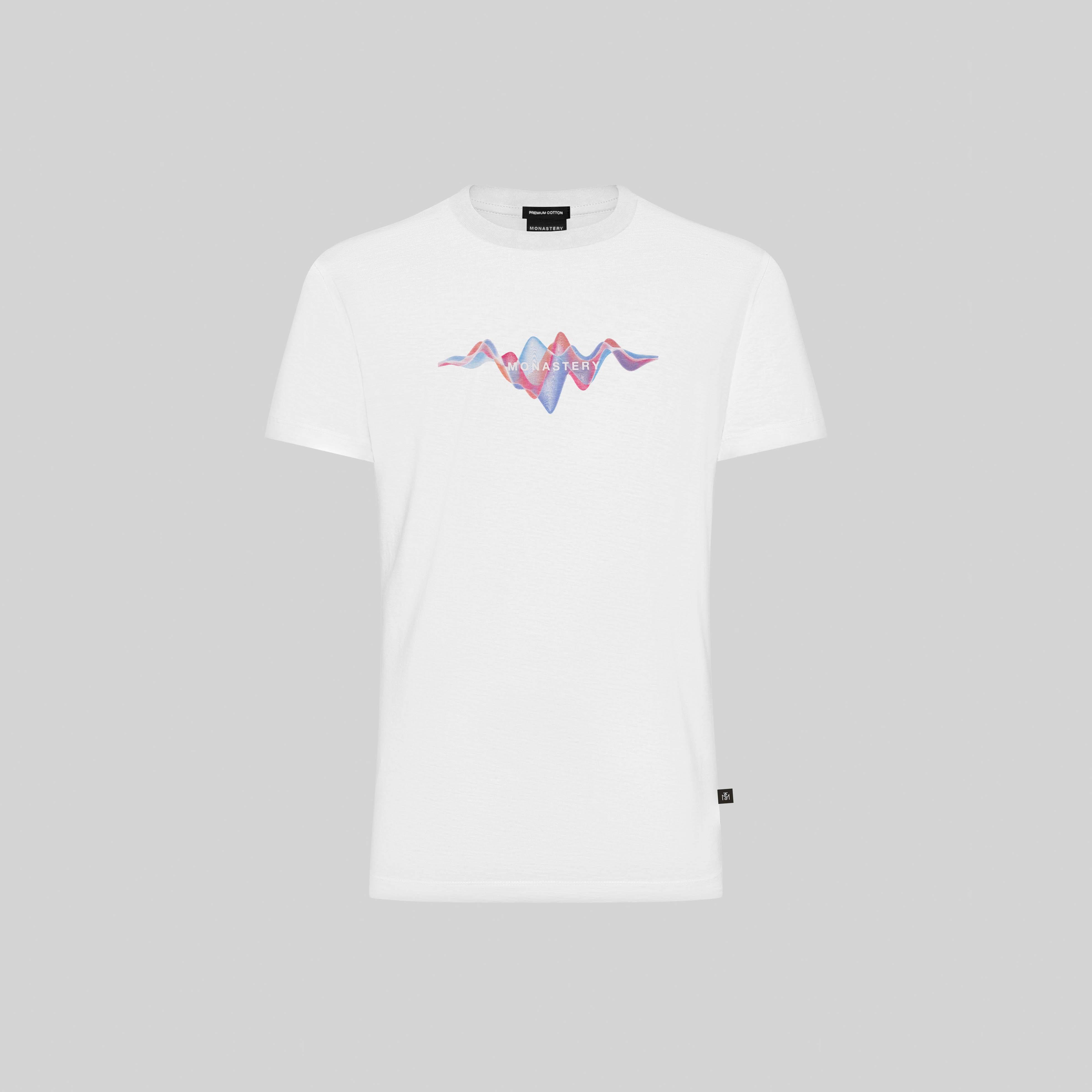 Actualizar disponibilidadLa camiseta Meghan para mujer está confeccionada en algodón Pima Peruano, un material reconocido por su suavidad y frescura. Presenta una silueta regular con el texto 'Monastery' estampado en alta densidad, enmarcado en un arte de ondas en colores pasteles degradados.