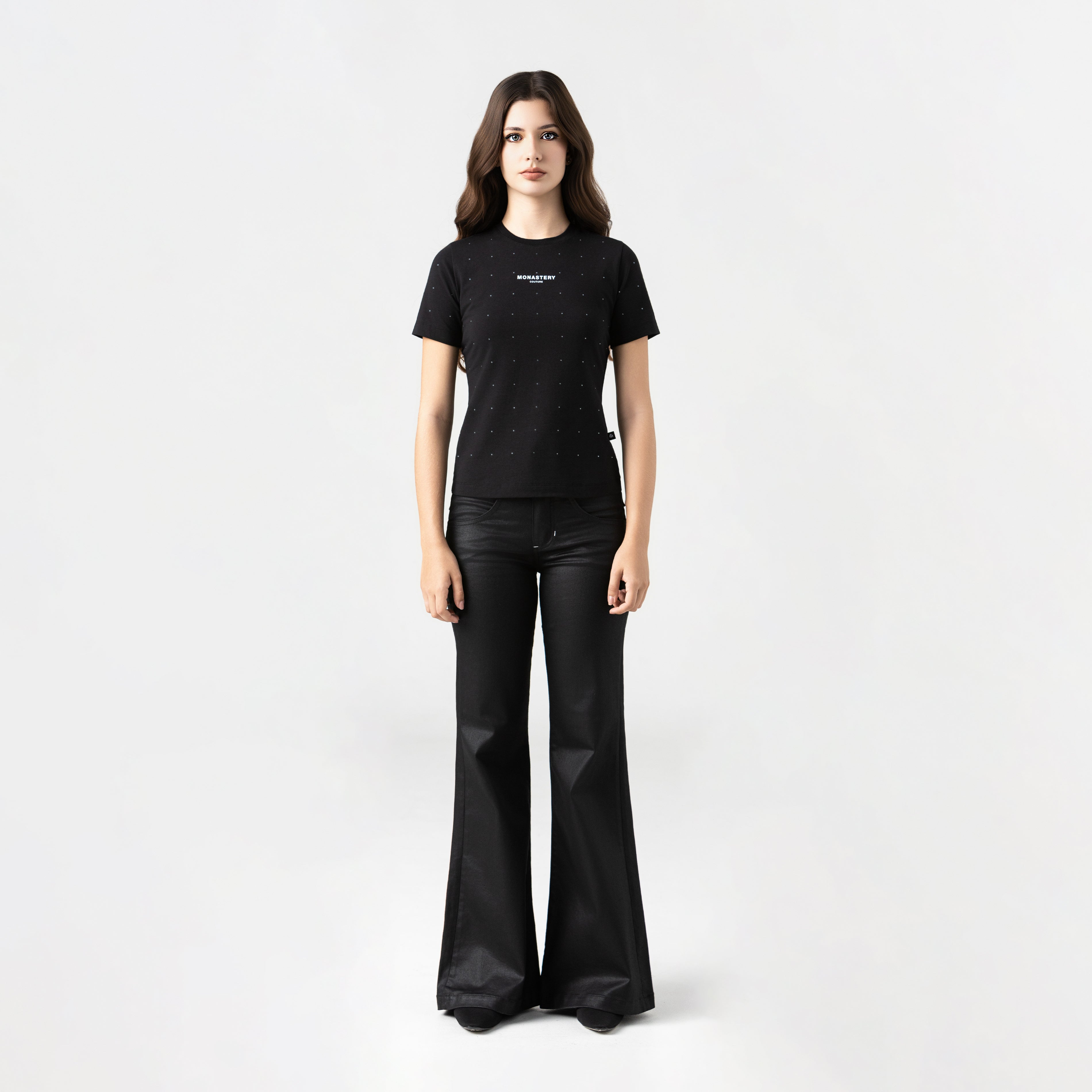 T-shirt femenina elaborada en silueta pequeña pensada para resaltar la figura femenina, atravez de su base textil, fresca y ajustada. Qylla es una referencia intervenida con aplicacion de cristales ubicados de forma continua en toda la prenda, dispuestos con presicion para generar un efecto dinamico, contiene el logo Monastery couture en centro frente en tecnica transfer el cual refuerza el contraste visual sin restarle protagonismo al diseño, la parte posterior cuenta con artes insignia en estampado plano ideal para destacar desde la elegancia.