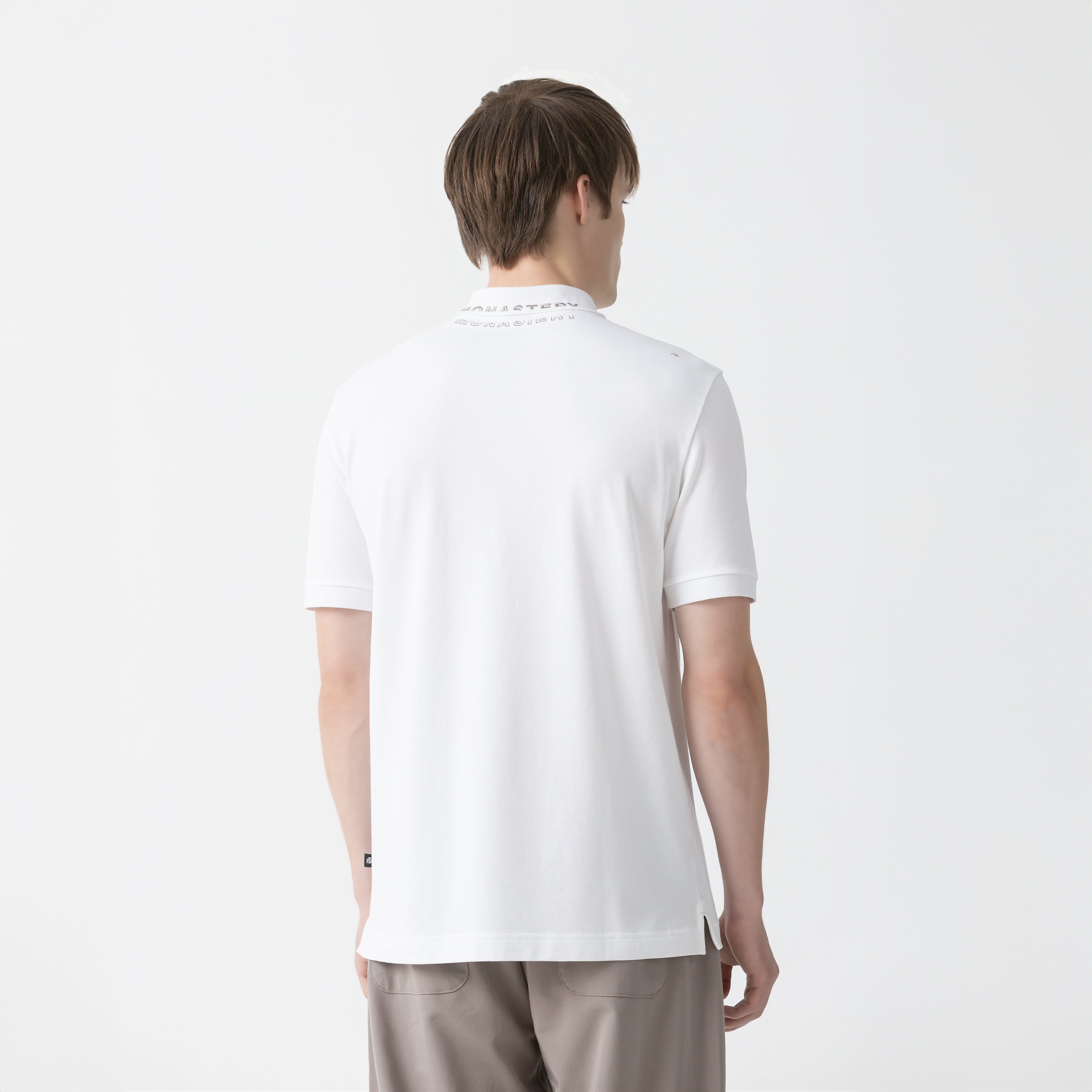 De silueta regular, presenta cuello tejido con tipping, que aporta un acento sofisticado y contemporáneo. En el frente, un bordado plano destaca con sutileza y precisión, mientras que en la parte posterior, un estampado plano complementa el diseño con equilibrio y sobriedad.