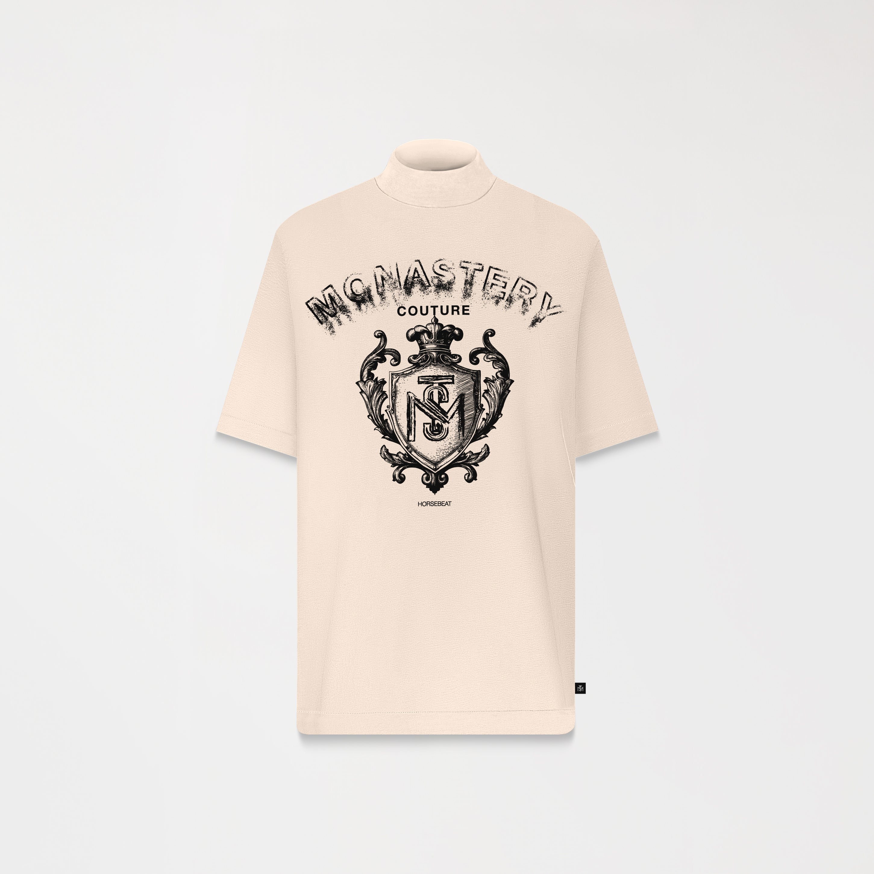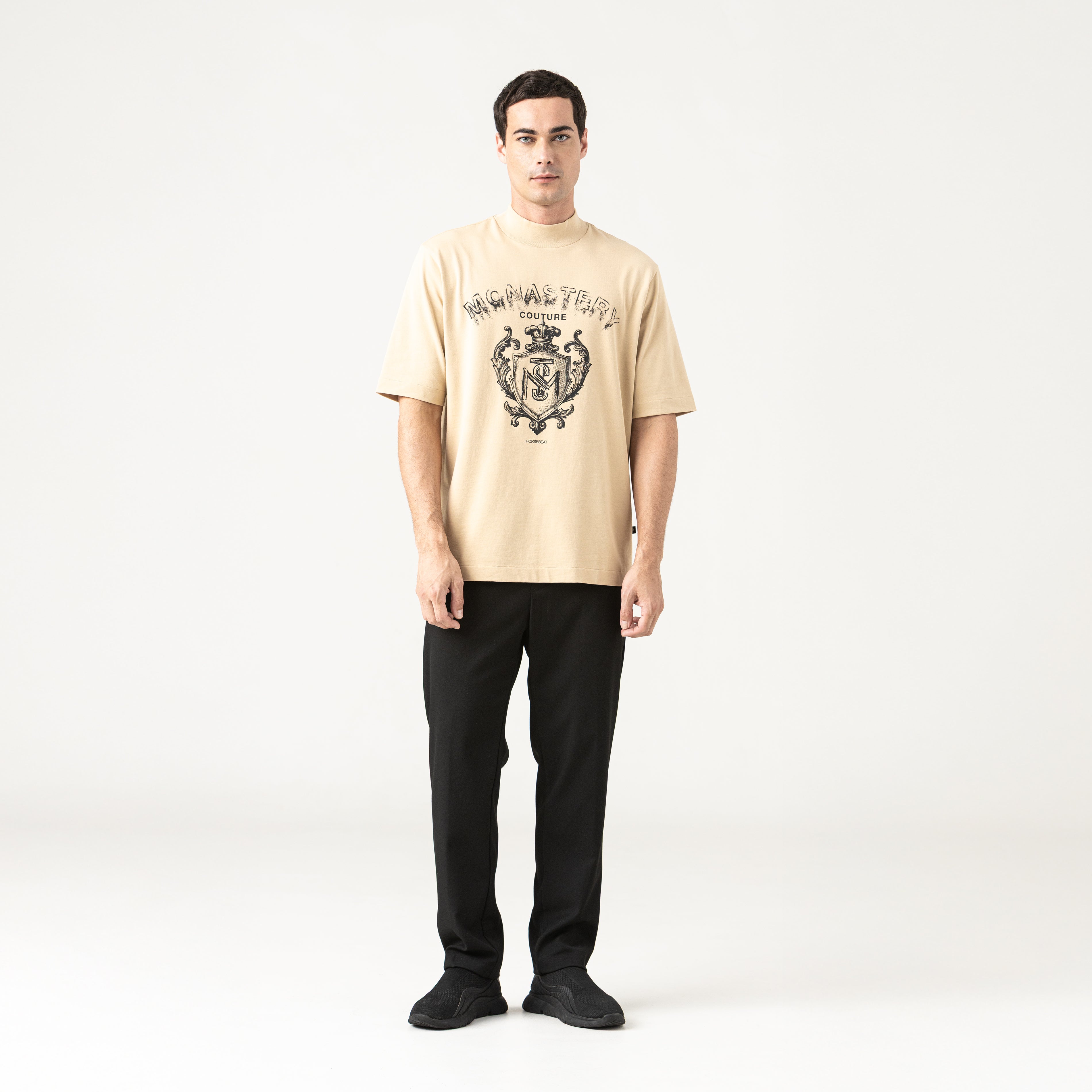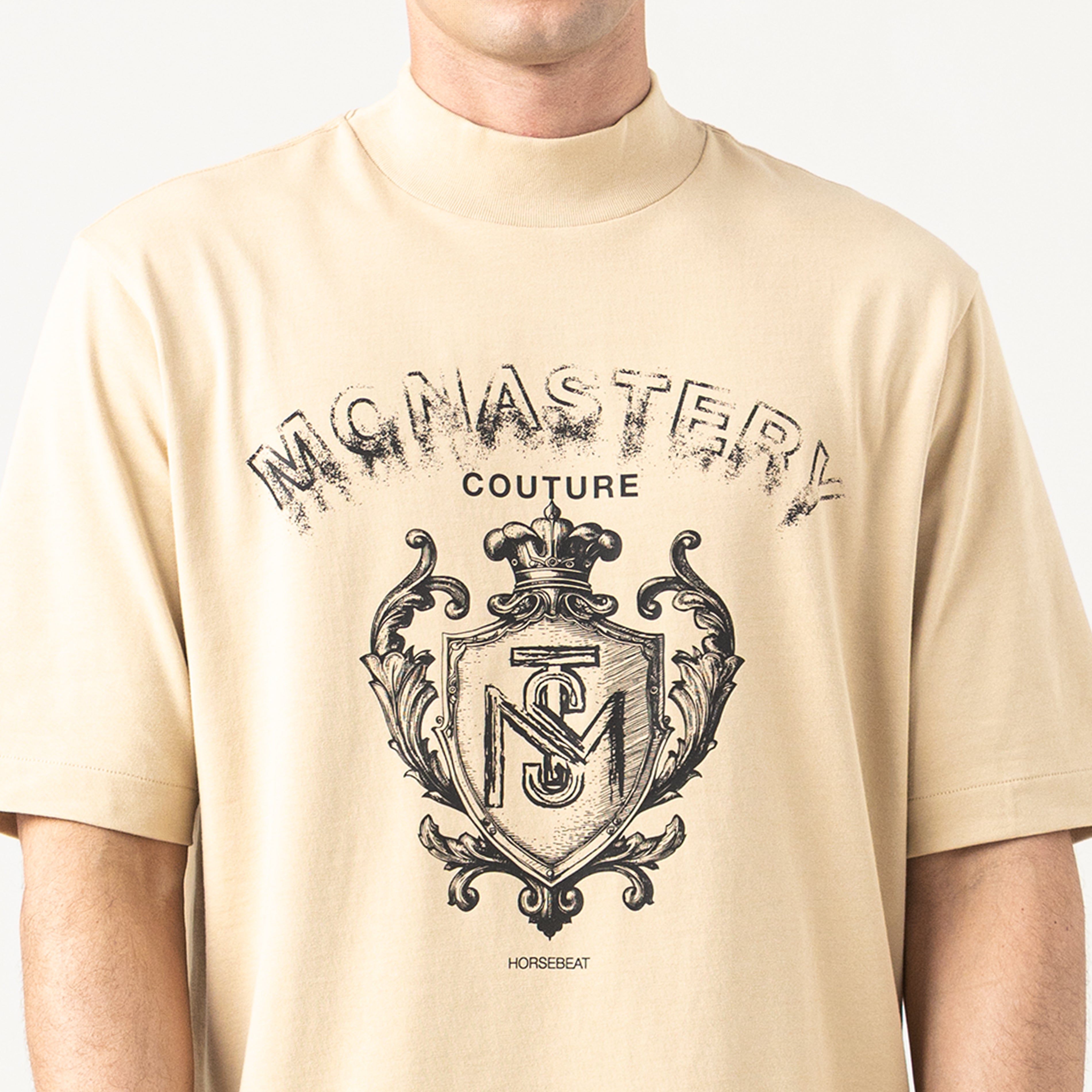 Sheval es una camiseta masculina. Esta camiseta de silueta oversized y cuello en rib de 5 cm está confeccionada en nuestra exclusiva tela Monastery 100% algodón, que ofrece estructura, suavidad y un fit relajado con carácter. El frente presenta un estampado plano con un diseño de escudo Monastery, símbolo de fuerza, legado y estilo atemporal. En la espalda, un estampado en alta densidad aporta textura y profundidad, cerrando una propuesta visual potente y equilibrada. Ideal para quienes visten con intención y confianza.