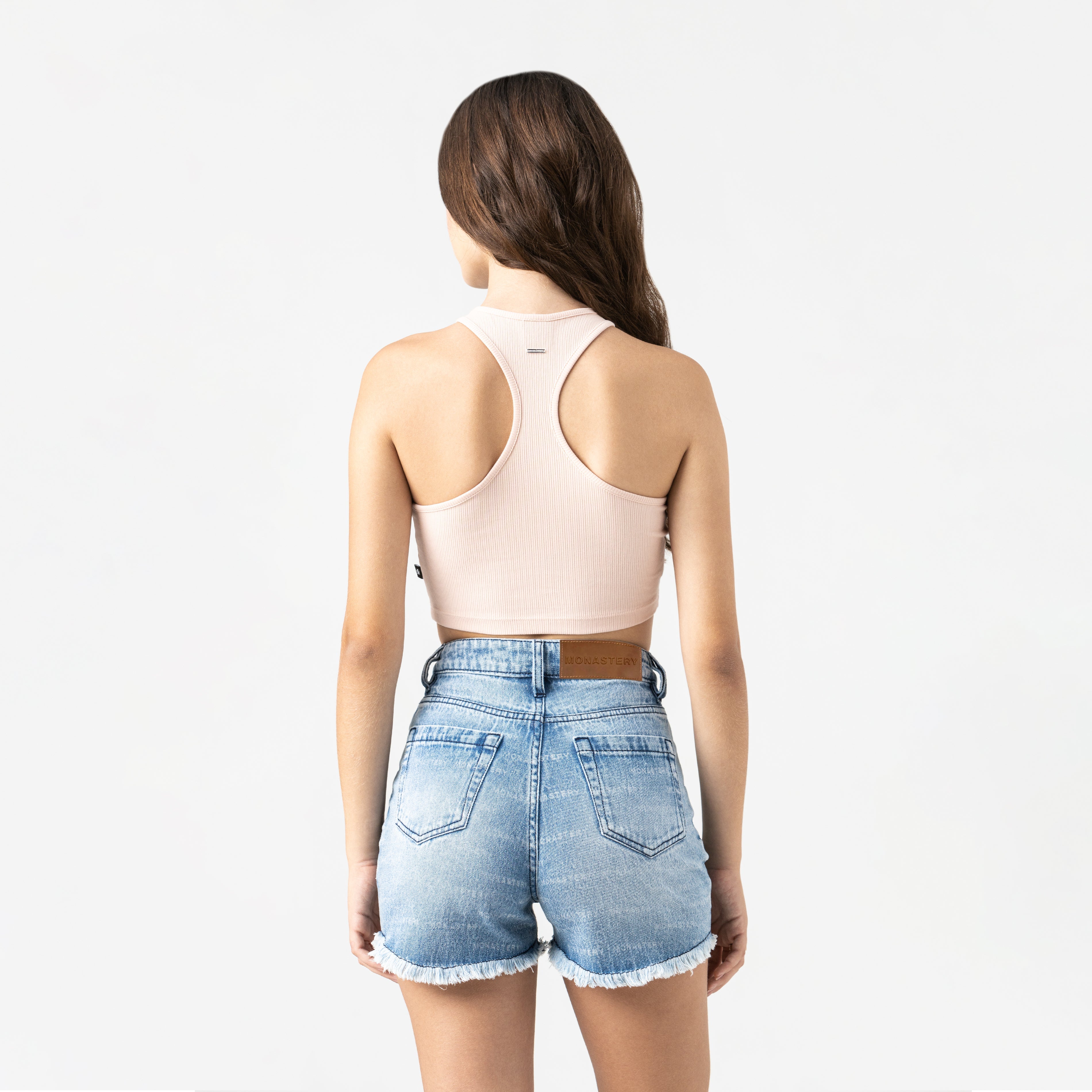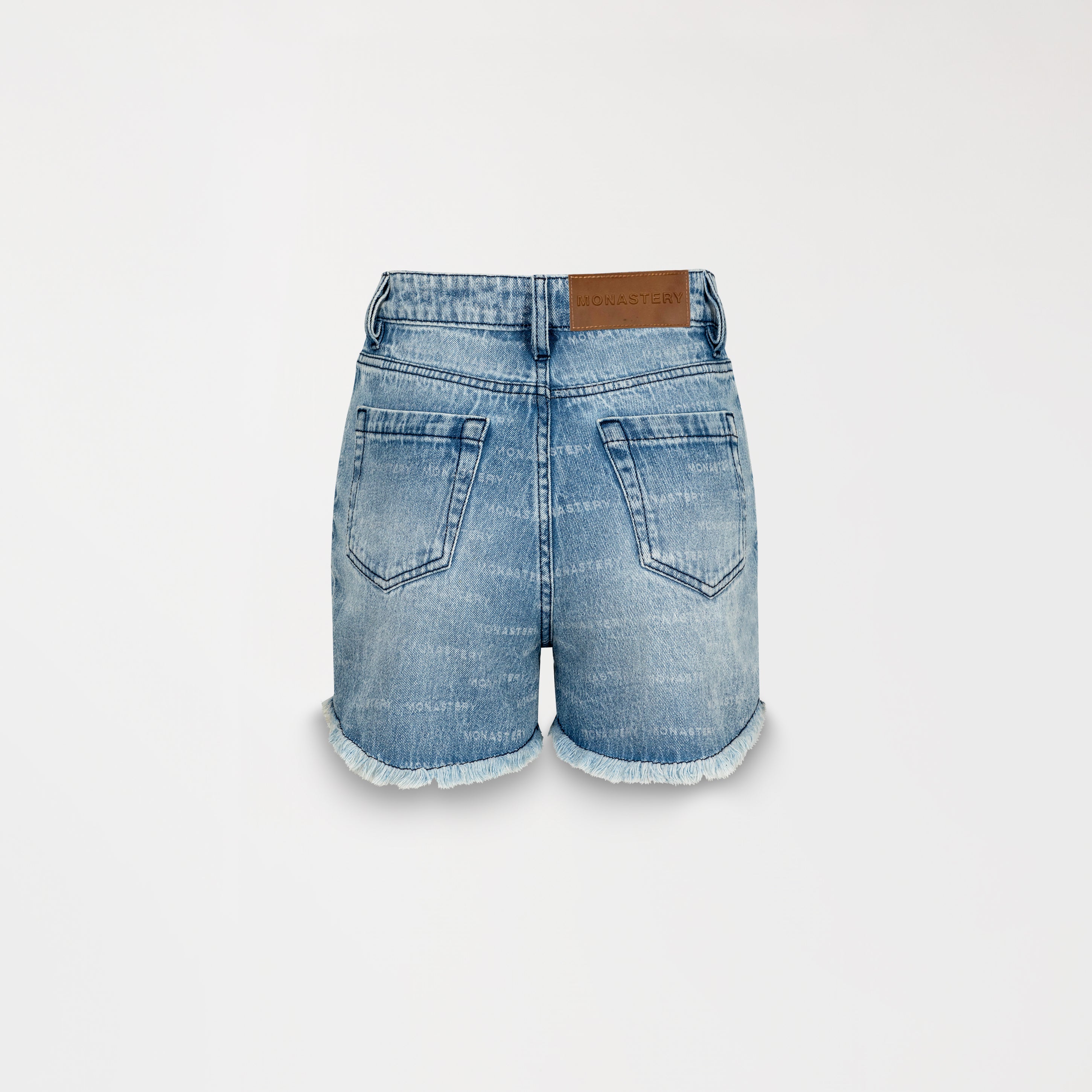 Short femenino de silueta corta, confeccionado en denim con lavado medio y rotos estratégicos que aportan un aire casual y contemporáneo. El monograma en láser introduce un sello de identidad sutil y distintivo, mientras que los insumos exclusivos Monastery elevan su valor estético y de confección.