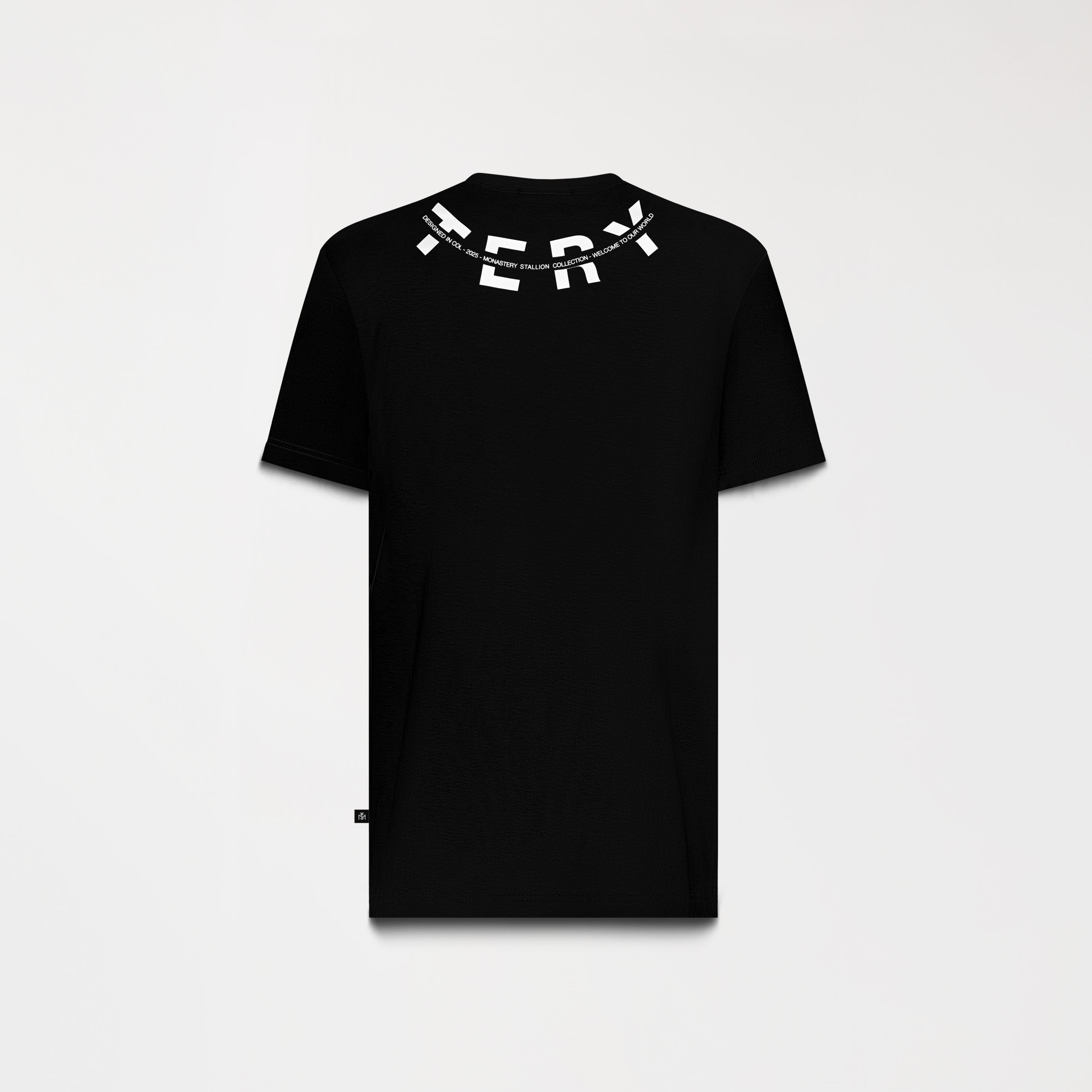 Utah es una T-shirt masculina confeccionada en 100% algodón ultra siliconado de alta calidad, que ofrece una textura suave y un acabado refinado. En el frente y la parte posterior, los artes se aplican en estampado plano combinando transfer mate para un efecto sin brillo y alta densidad, que aporta volumen y relieve táctil. El diseño presenta la palabra Monastery distribuida estratégicamente entre ambas caras, generando una continuidad gráfica envolvente que refuerza la identidad visual de la marca.