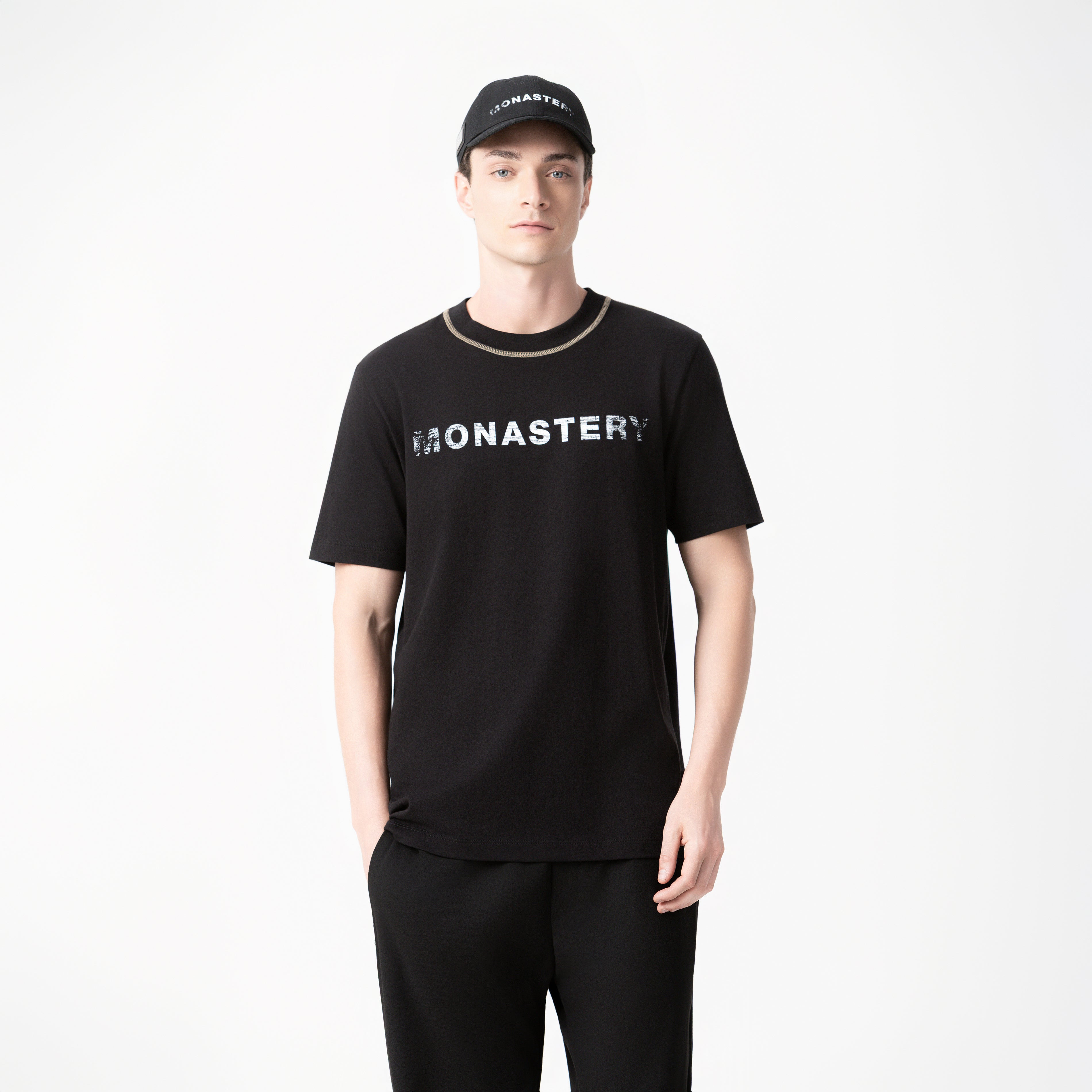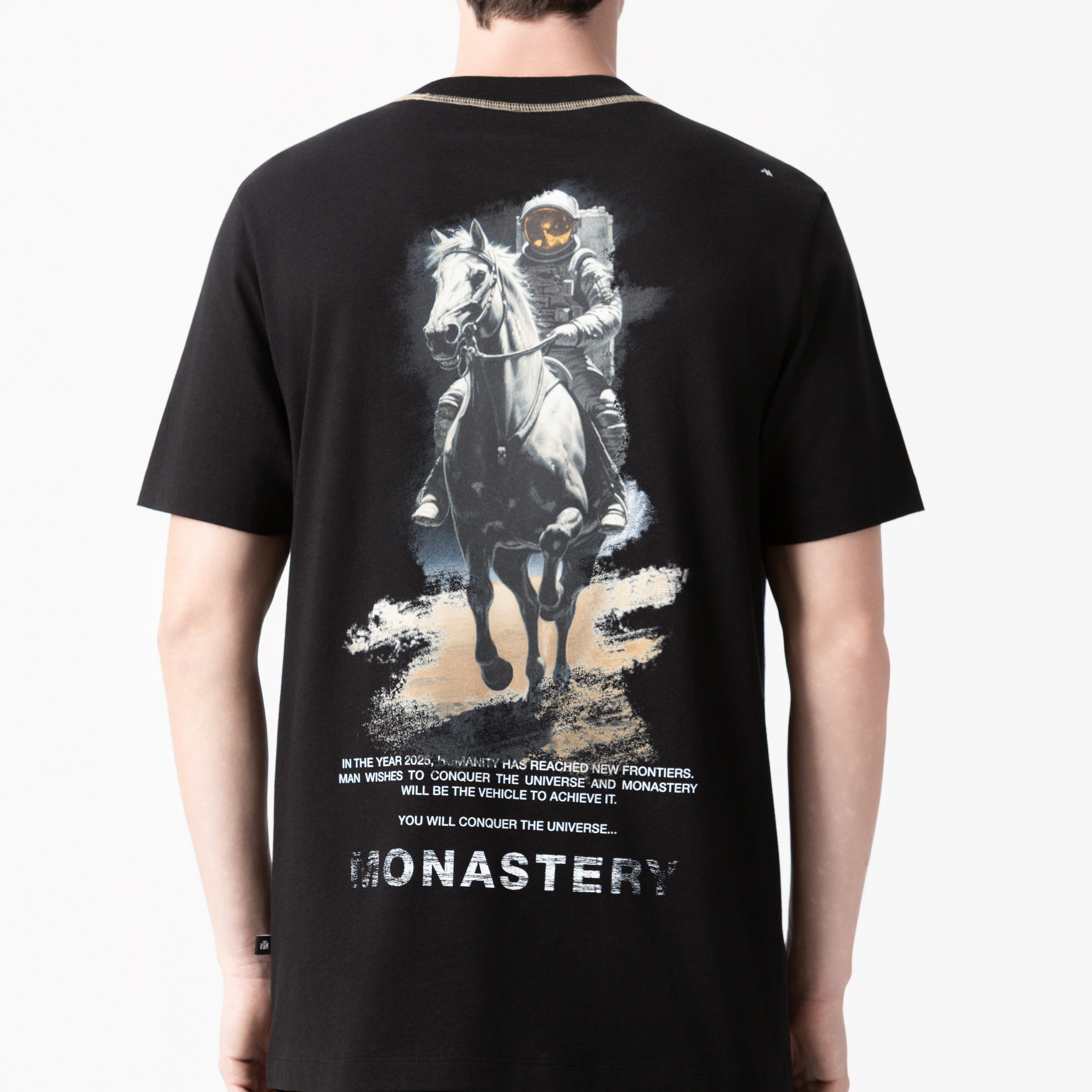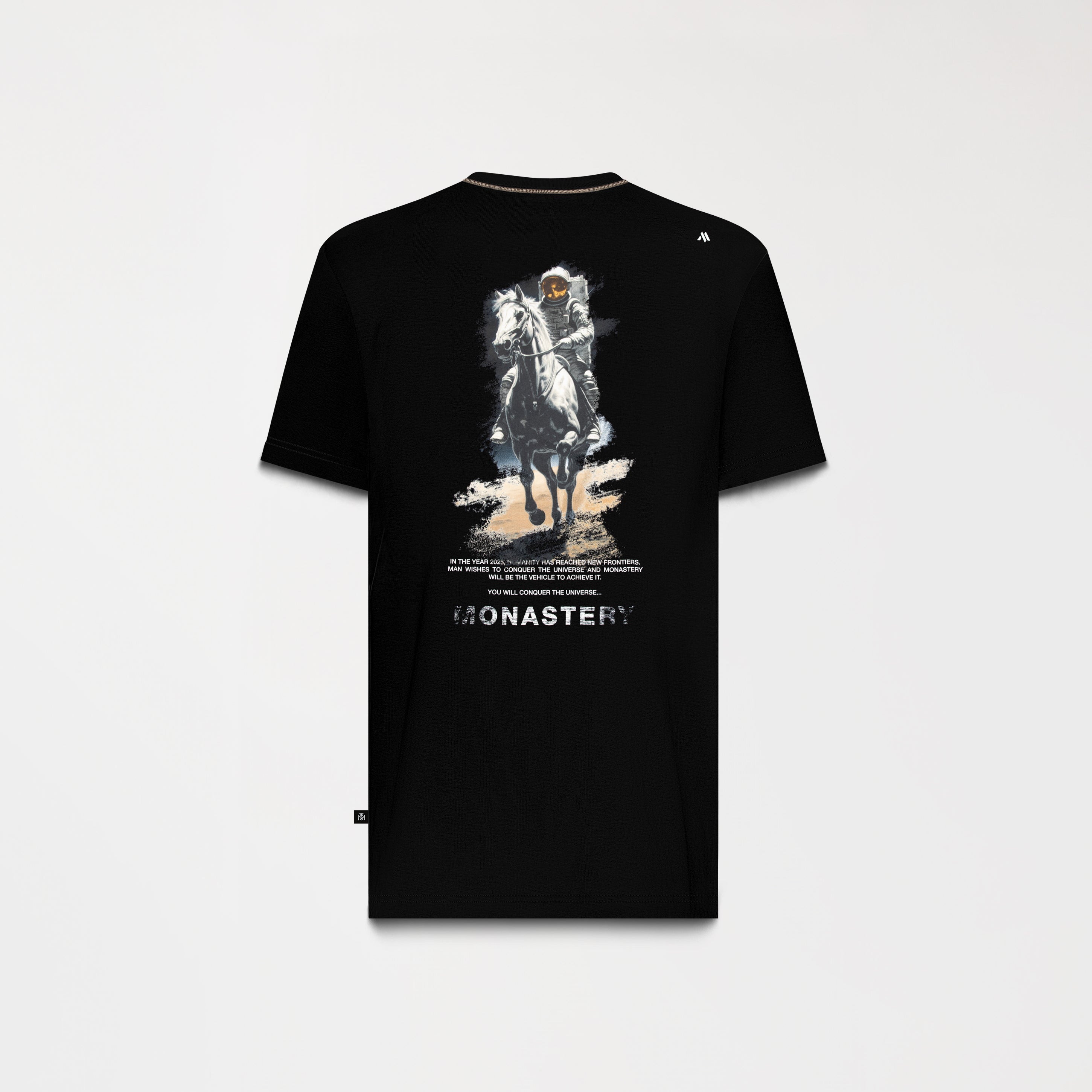 Wesley es una T-shirt de silueta regular confeccionada en tela Monastery 2, un tejido 100% algodón que equilibra confort y estructura. En el frente, presenta el logo de la marca aplicado en estampado plano, mientras que en la parte posterior destaca la figura del icónico astronauta Phillip, símbolo distintivo de la identidad Monastery. Las costuras en contraste en el cuello aportan un detalle sutil y deliberado que refuerza el carácter visual de la prenda.