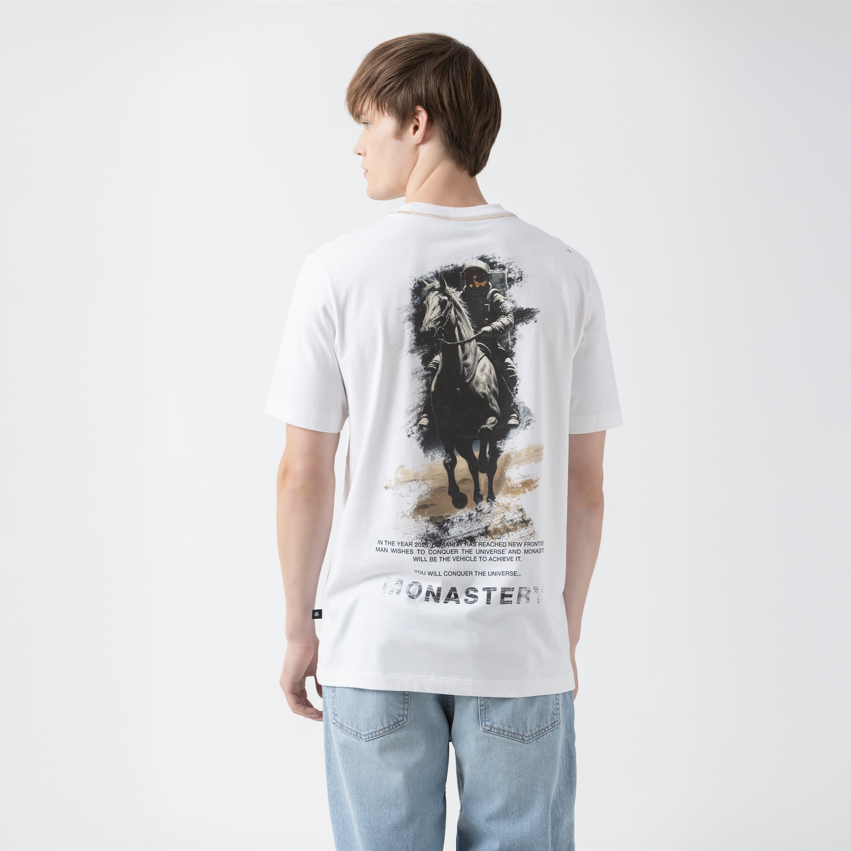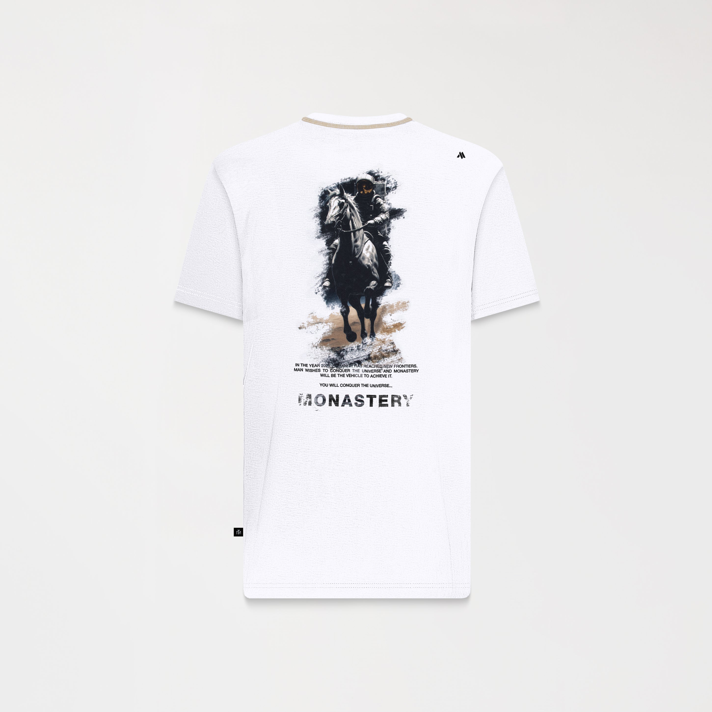 Wesley es una T-shirt de silueta regular confeccionada en tela Monastery 2, un tejido 100% algodón que equilibra confort y estructura. En el frente, presenta el logo de la marca aplicado en estampado plano, mientras que en la parte posterior destaca la figura del icónico astronauta Phillip, símbolo distintivo de la identidad Monastery. Las costuras en contraste en el cuello aportan un detalle sutil y deliberado que refuerza el carácter visual de la prenda.