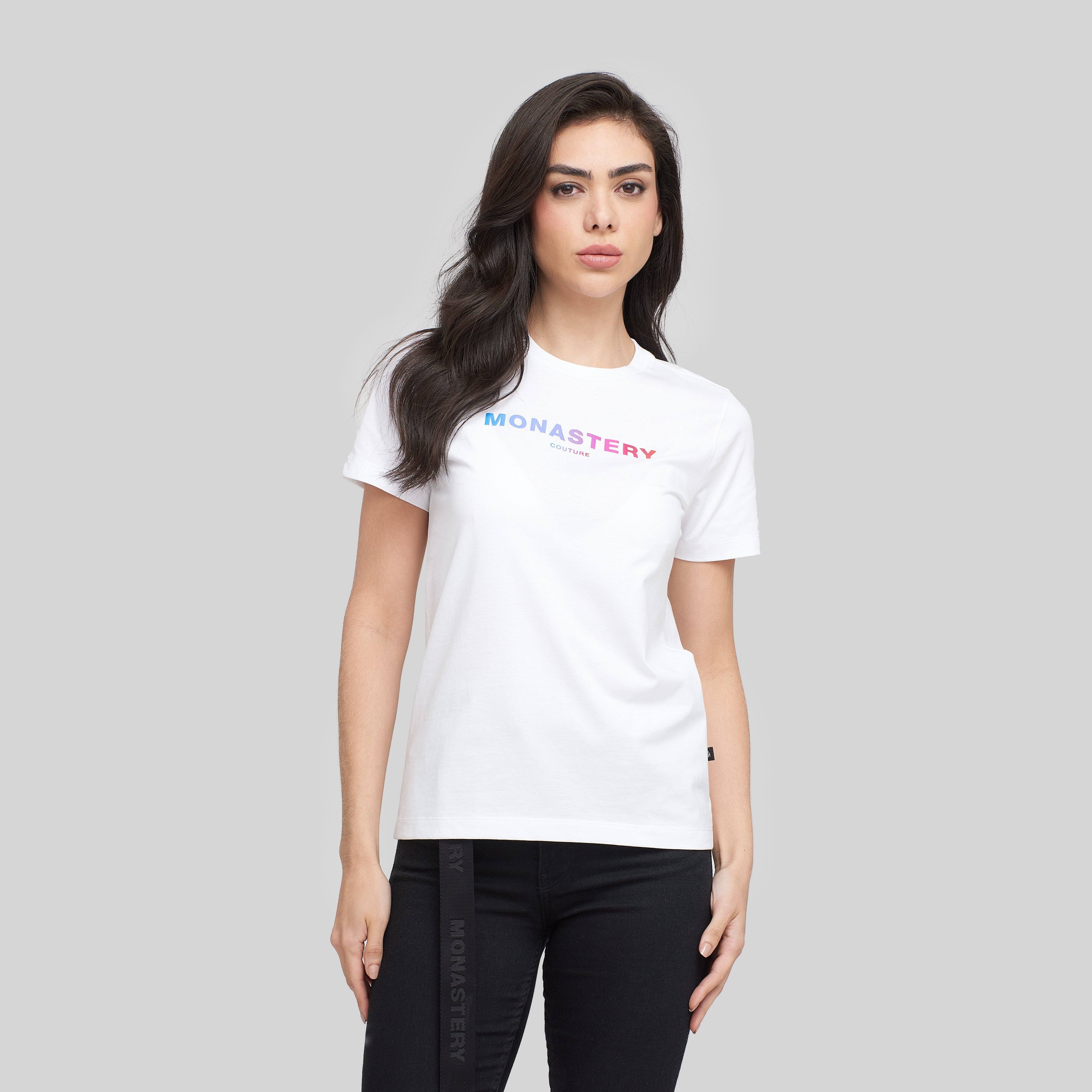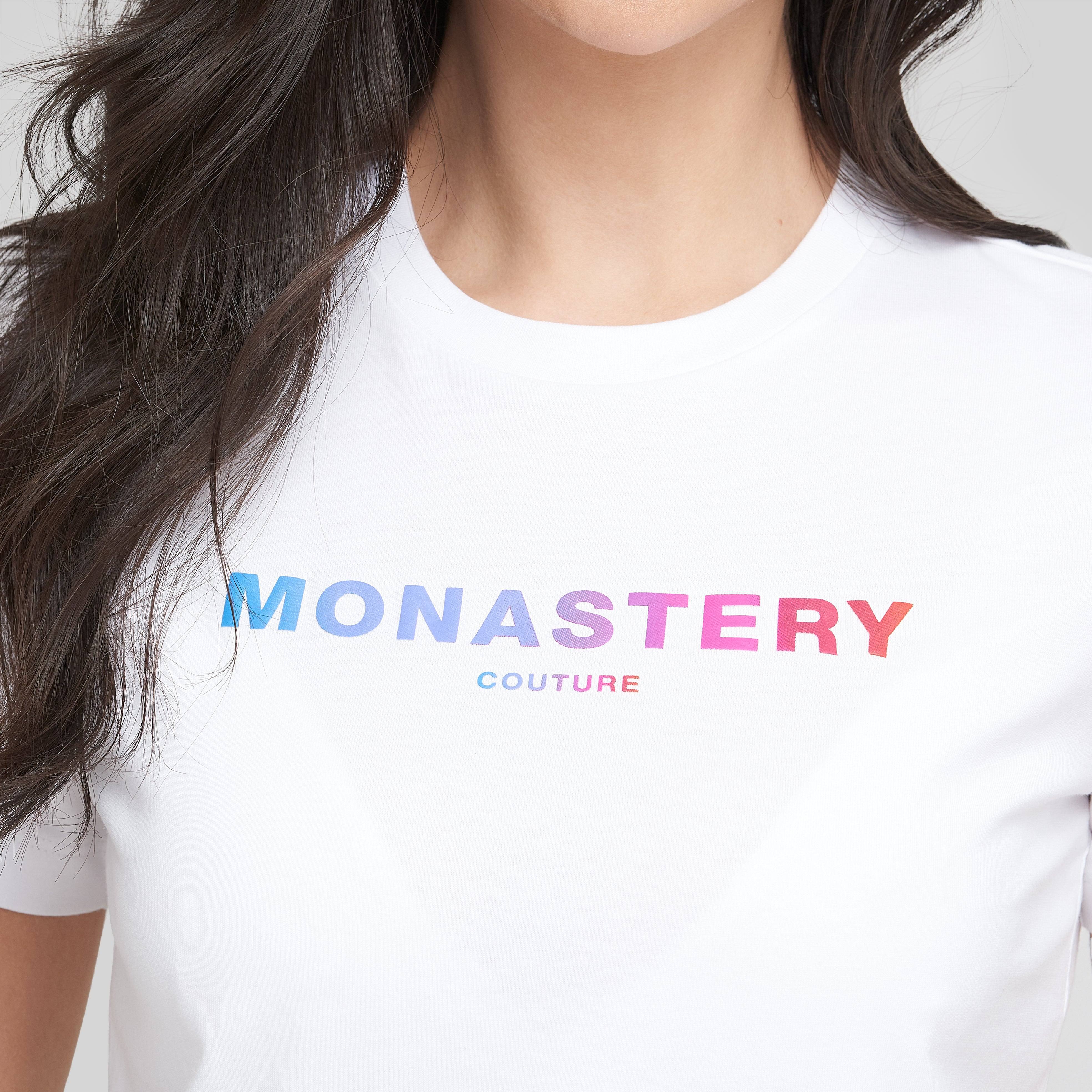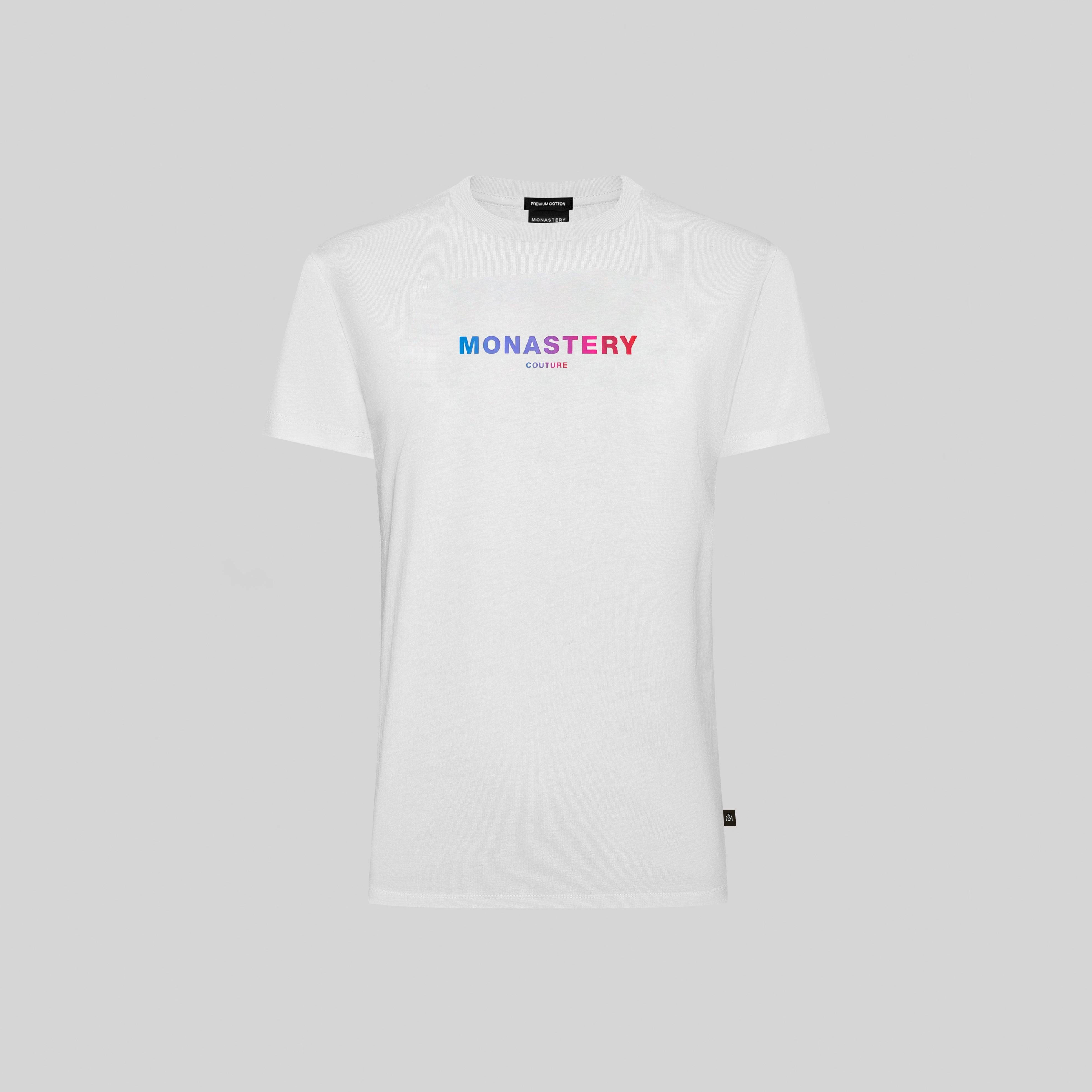 Actualizar disponibilidadCamiseta de mujer en algodón Pima Peruano, un material reconocido por su suavidad y frescura. Está confeccionada en una silueta regular con el texto 'Monastery' en alta densidad, degradado desde el azul, pasando por el violeta hasta el rojo.